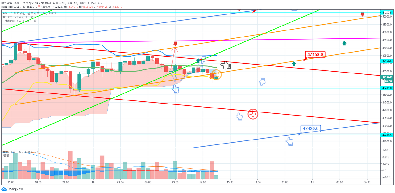 (SHORT) 1. 진입 지점 : 46580.1 지점을 하향 돌파시 목표 지점 : 1차 45151.1 지점 이하, 2차 43722.0 지점 이하 Stop Loss : 47294.7 지점