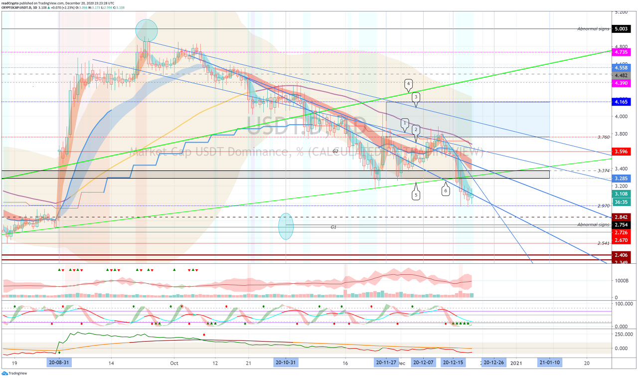 USDT 도미넌스가 상승 추세선 (6)이나 3.285-3.374 구간에서 저항을 받고 하락하는지 확인해야 합니다.