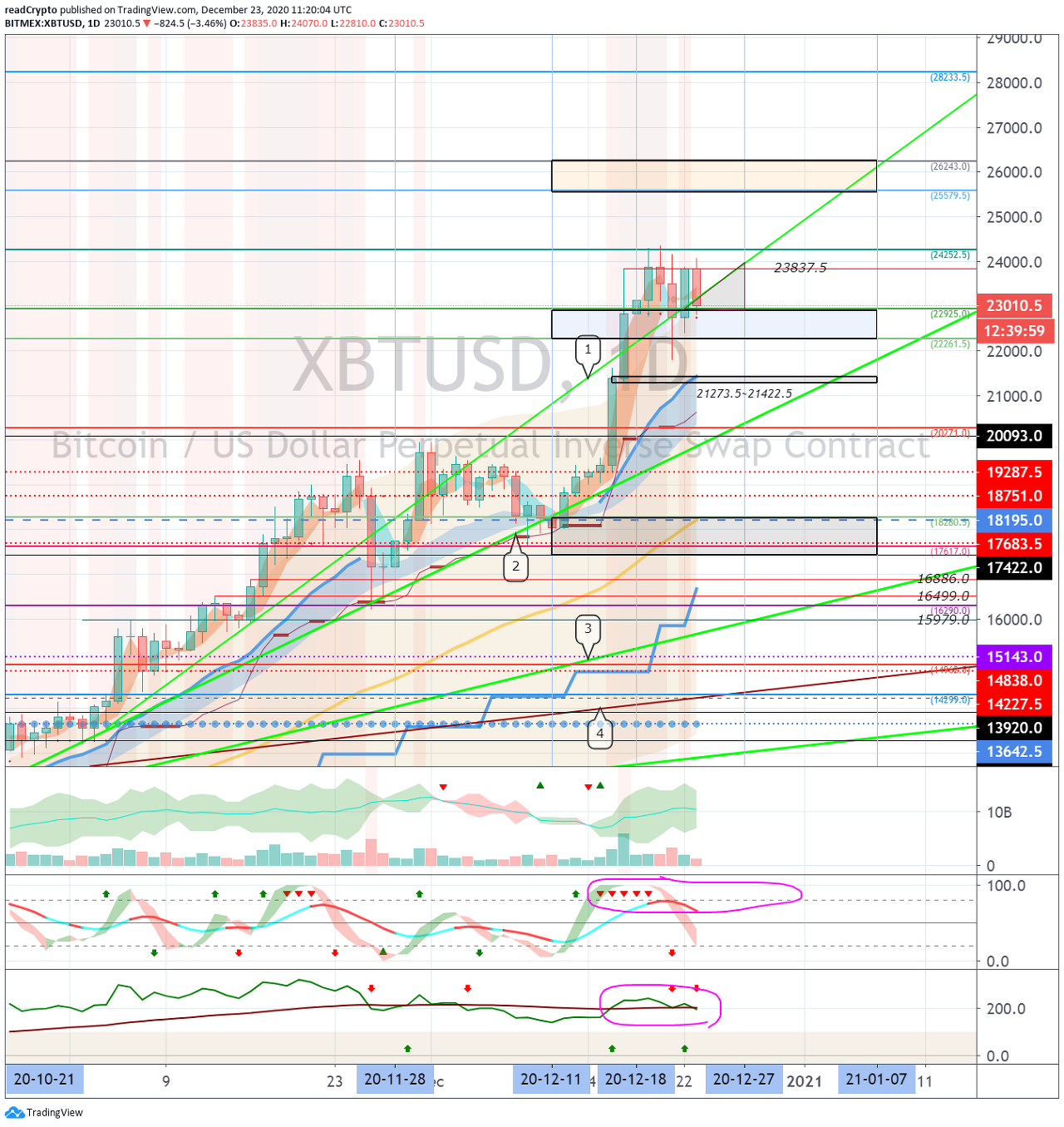 12월 24일경의 변동성으로 23715.0 지점에서 지지를 받고, 상승 추세선 (2)을 따라 상승할 수 있는지 지켜봐야 합니다.