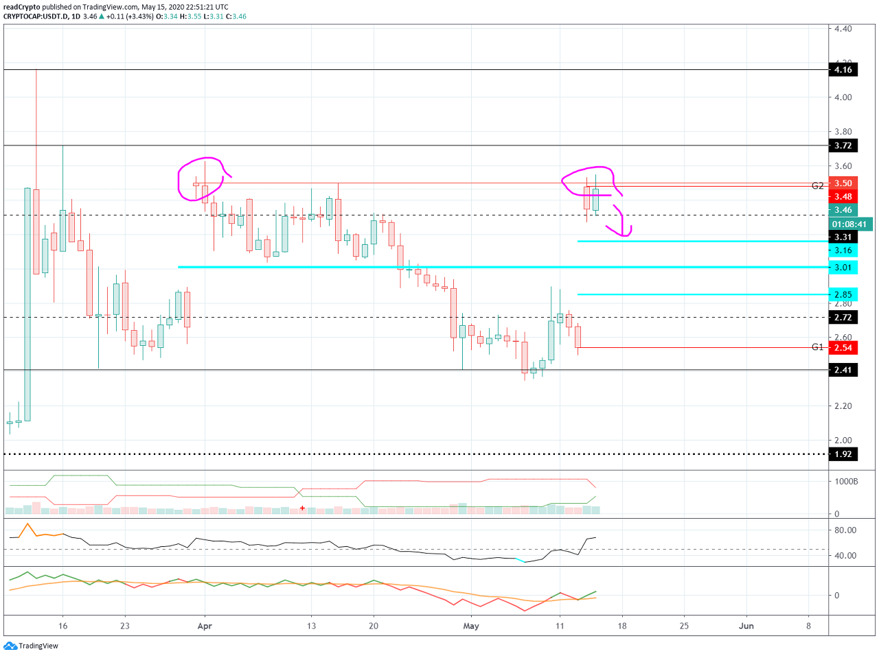 BTC 도미넌스가 5월 21일 이후에 67.97 지점 이하로 하락하여 있는지 확인이 필요합니다.