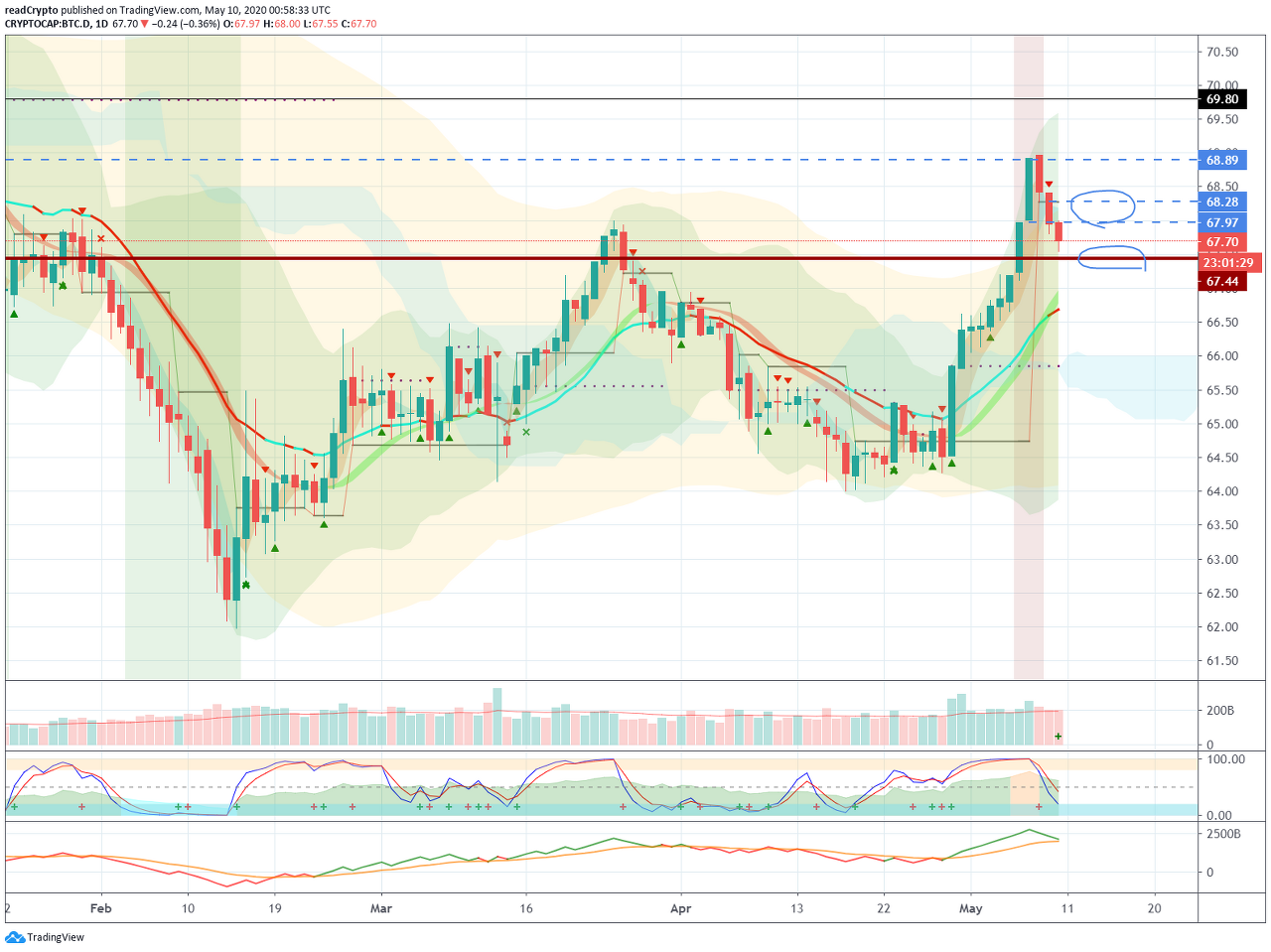 또한, BTC 가격이 진정되었을 때 BTC 도미넌스가 67.97 지점 이하에 있는지도 확인할 필요가 있습니다.