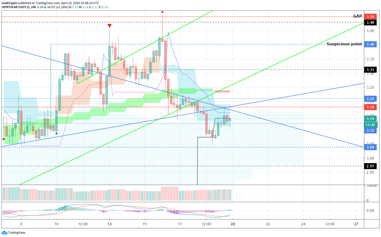 RSI 50 지점 근처로 하락해 있습니다. 자금의 흐름이라 RSI 지표를 적용한다는게 좀 애매한 부분이 있지만, 현재 USDT 도미넌스는 하락 추세에 있다고 볼 수 있습니다. 확실한 하락 추세라고 볼 수 있는 지점은 3.04 지점 이하로 하락하는 것 입니다.