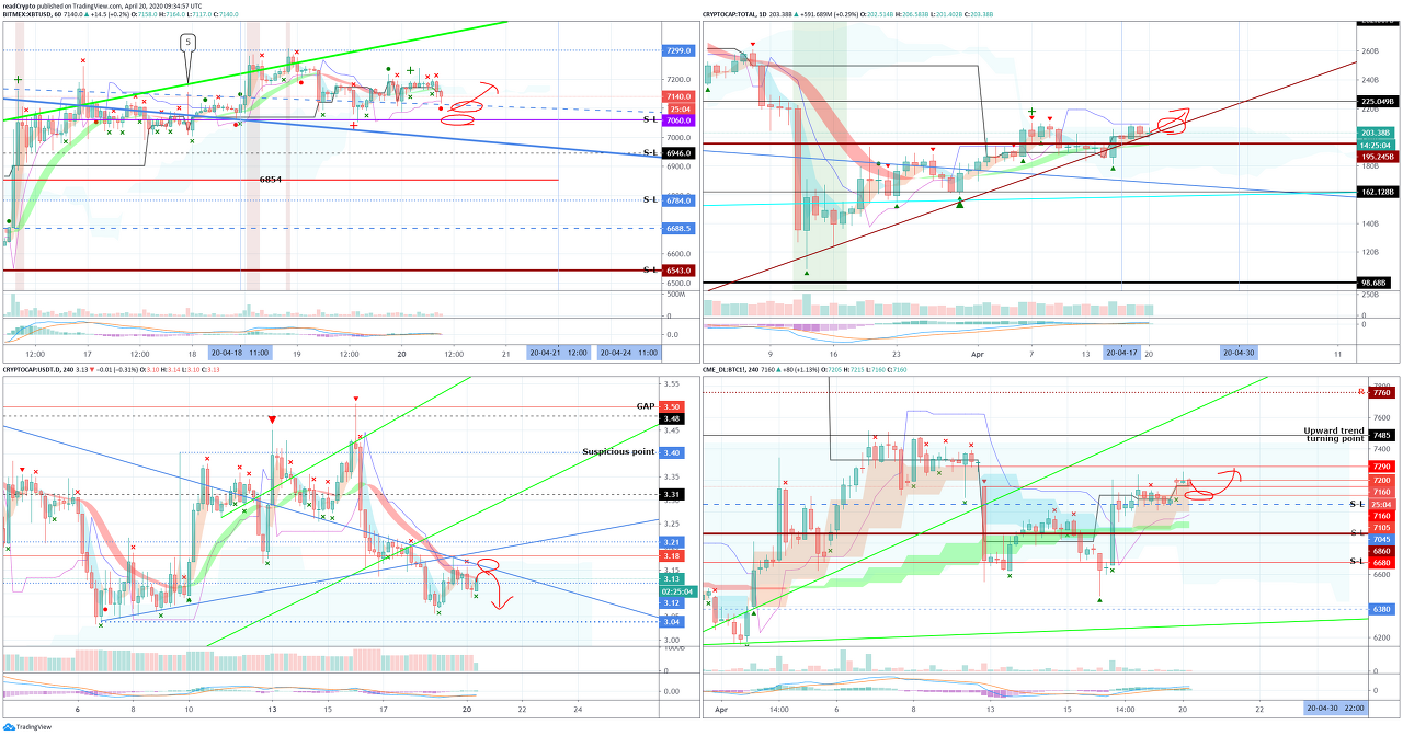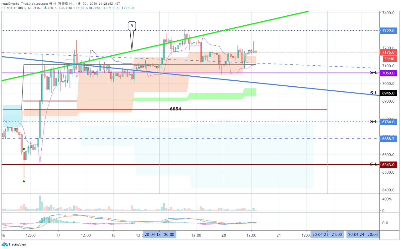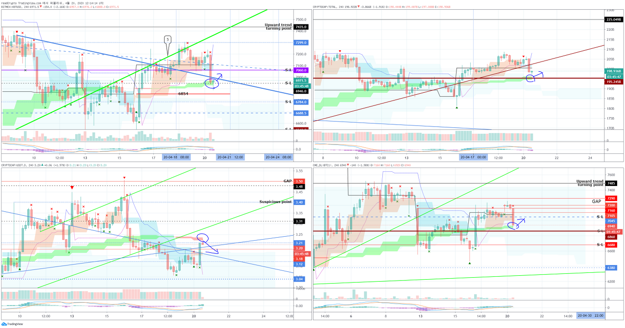 이 분석글을 말씀드렸듯이 6946 지점을 터치하였습니다. 다행히 빠르게 복귀 중 있습니다. 6854 지점을 터치하지 않은 이상 상승 추세를 유지할 가능성이 크다고 생각하고 있습니다. 다만, 4월 24일경에 7060 지점 이하로 하락하게 된다면, 일시적으로 반등이 있을 수는 있지만, 하락 추세로 전환될 가능성이 높다고 예상하고 있습니다.