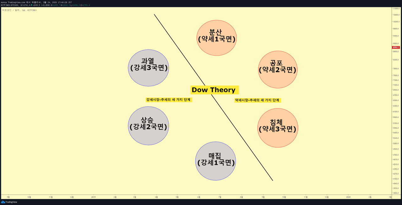 다우이론은 기술적 분석의 창시자이며 미국의 월스트리트 저널을 창간한 찰스 다우가 제창한 이론으로 19세기 말부터 20세기에 걸쳐 시장을 분석한 결과 시장은 무작위로 움직이는 것이 아니라 시장 전체의 흐름 방향이 다음과 같은 세 가지 종류의 주기적인 추세에 의해 영향을 받는다는 가설을 정립하였습니다