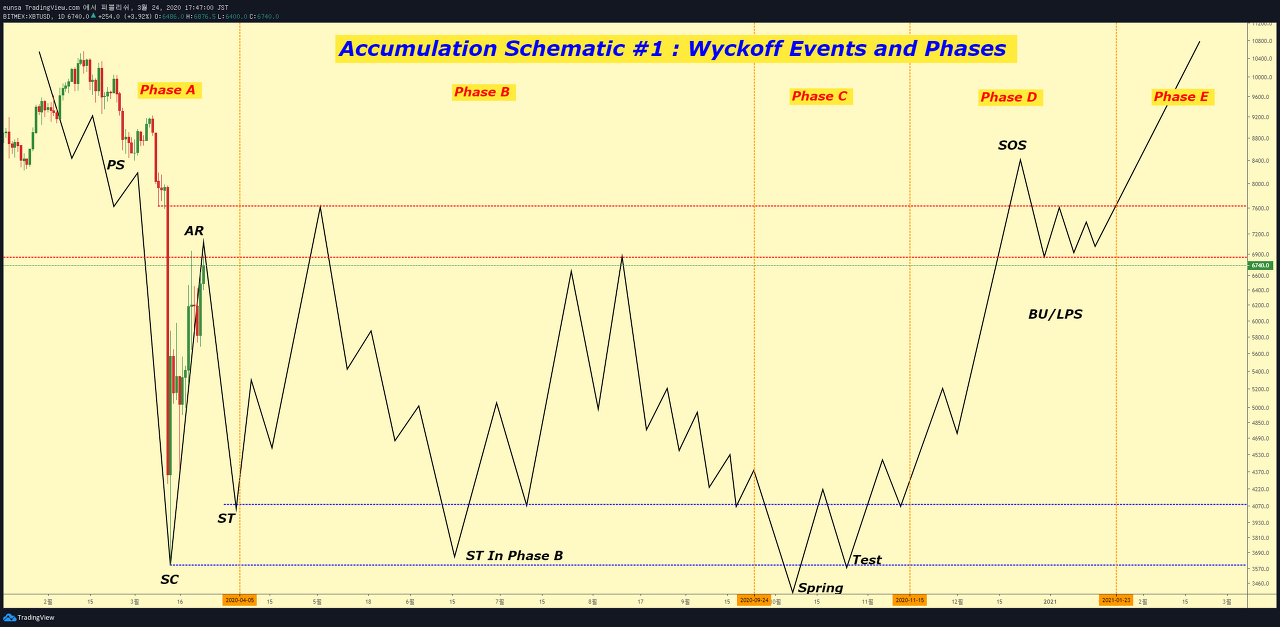 (3) Accumulation Schematic #1 : Wyckoff Events and Phases 거시적인 측면으로 보자면, 현재 단기 상승추세의 기울기가 상당히 급합니다 이것은 급격한 하락에 따른, 되돌림 또한 강하게 나오는 AR (Automatic Rally) 부근으로 추정합니다