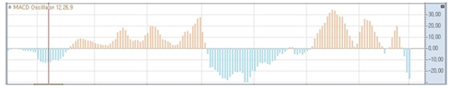 오실레이터의 값이 +를 나타내면 현재 시장은 상승추세에 있음을 나타내는 것이고 -를 나타내면 하락추세에 있음을 나타냅니다. 오실레이터 값이 0을 나타내면 장기 이동평균선과 단기 이동평균선이 교차하는 시점이며 이것을 매매시기로 봅니다 오실레이터값이 하락추세에서 즉 -에서 0선을 교차할 때가 매수시점이고 오실레이터 값이 +에서 0선을 교차할 때가 매도시점입니다. 오실레이터 값이 상승추세를 나타내더라도(0값 위에 있더라도) 최고값 이후 상승폭이 둔화되면 시장가격은 상승에서 하락할 가능성이 많고 하락추세에 있더라도(0값 아래에 있더라도) 최저값 이후 하락 폭이 둔화되면 시장가격은 하락에서 상승으로 전환될 가능성이 많은 것입니다,