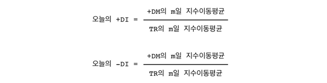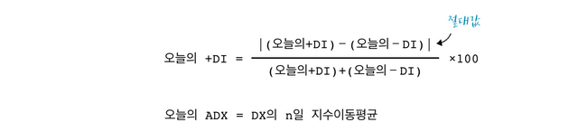 모든 지표의 계산은 차트에서 해주기 때문에 직접 할 필요는 없지만 알아두면 원리를 이해할 수 있다 ADX는 +DI와 ﹣DI의 거리를 측정하여 평활한 것이다