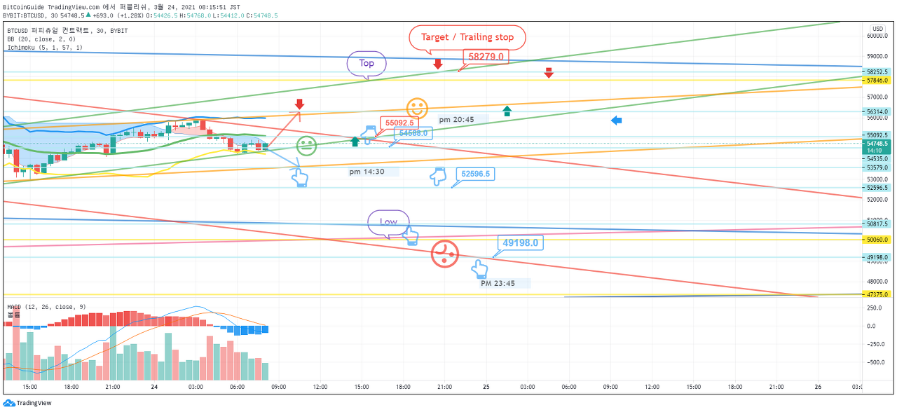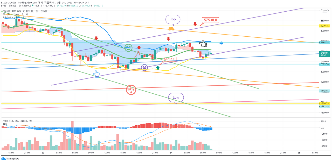 3월 24일경전까지 55828.0-60904.0 구간에서 횡보하였다가 이 구간에서 벗어나는 변동성이 발생할 것으로 예상하였습니다.