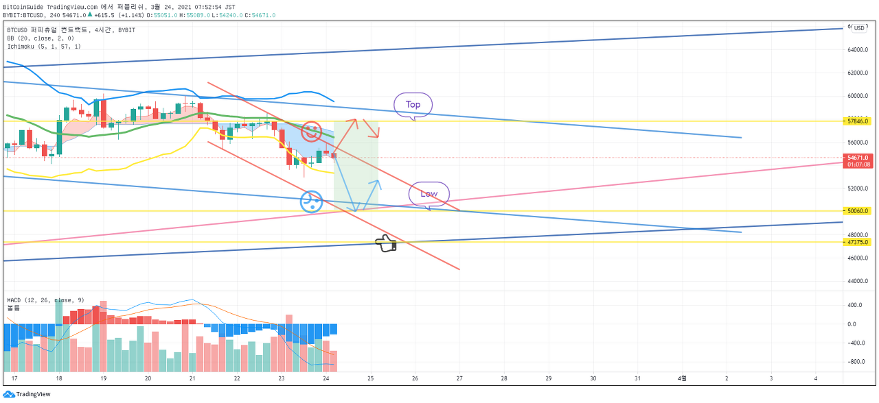 이에 따라서, 단기 하락 추세로 전환되었다고 말하기 위해서는 54122.5-55828.0 구간에서 저항을 받는 모습을 확인해야 합니다.
