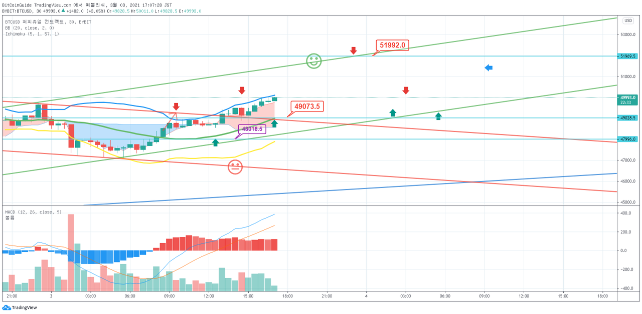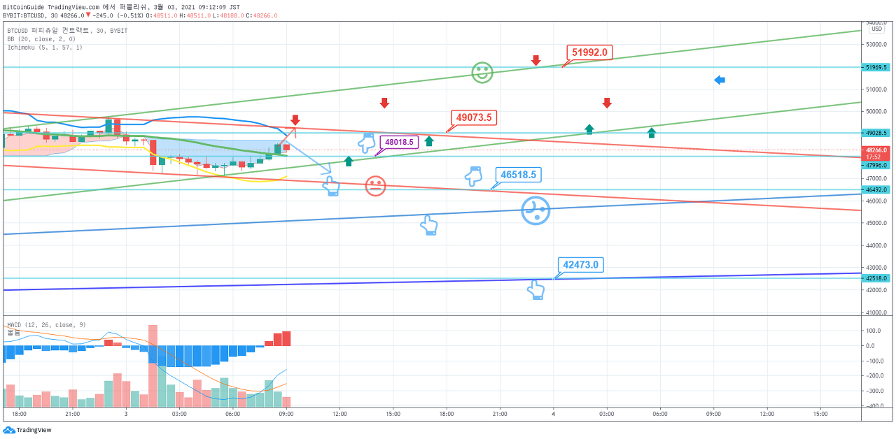 갭 (49182.5-49437.5) 상승으로 시작하였습니다. 45202.5-49934.0 구간에서 벗어나는 움직임이 나오는지 지켜봐야 합니다. 45202.5 지점에서 하락한다면, 단기 Stop Loss가 필요합니다.