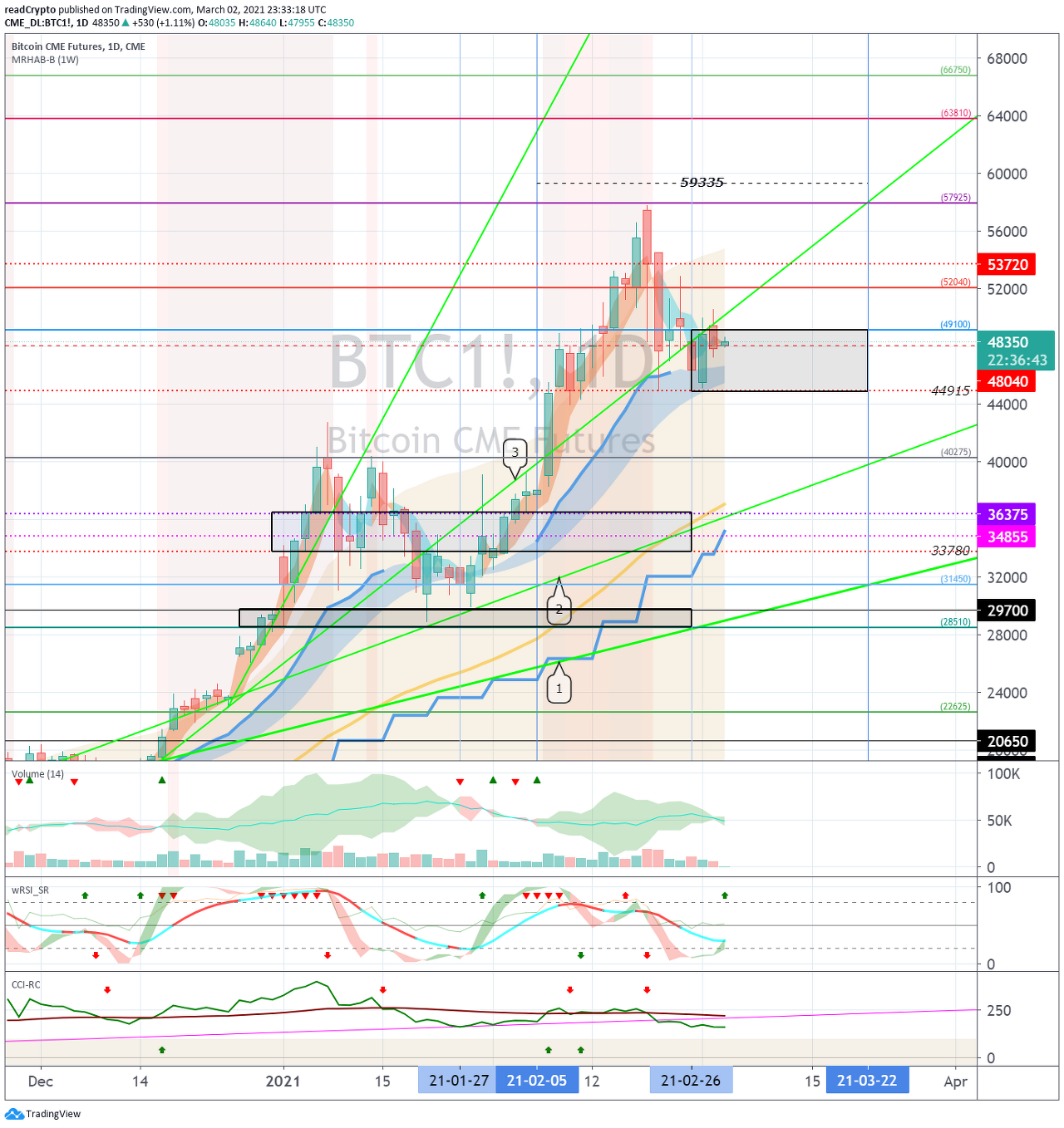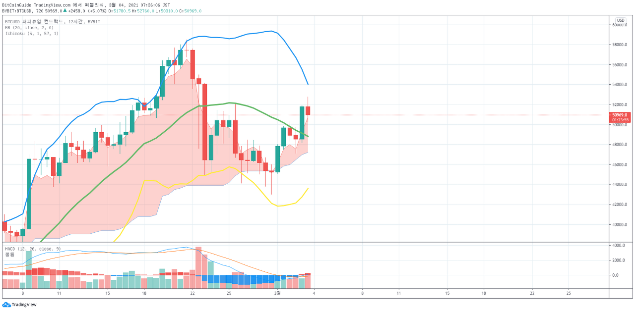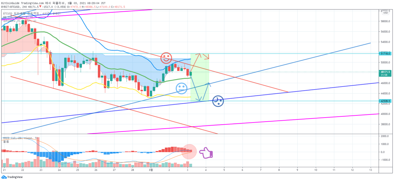 갭 (51347.5-51302.5) 하락으로 시작하였습니다. 49934.0 지점에서 지지를 받고 상승 추세선 (3)을 따라 상승할 수 있는지 지켜봐야 합니다. 45202.5 지점에서 하락한다면, 단기 Stop Loss가 필요합니다. 다음 변동성 기간은 3월 12일경 입니다.