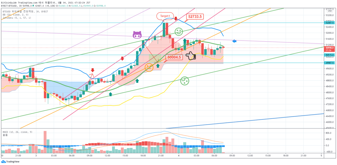 (SHORT) 1. 진입 지점 : 52330.0 지점을 하향 돌파시 목표 지점 : 1차 48323.0 지점 이하, 2차 44316.0 지점 이하 Stop Loss : 53666.0 지점