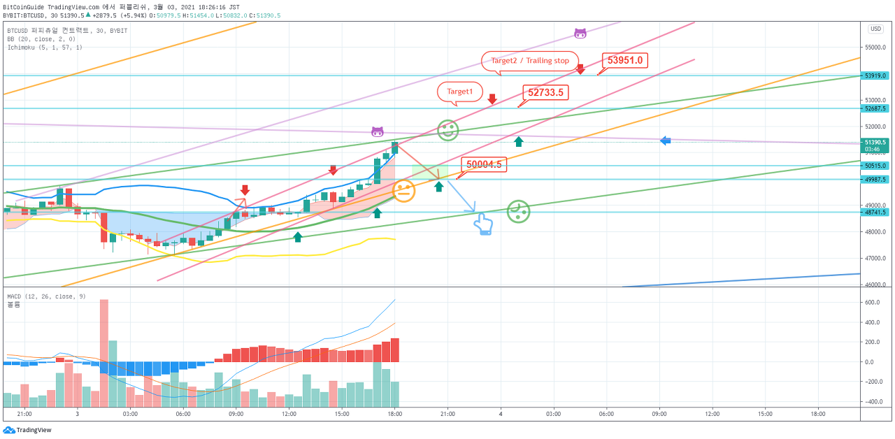 무리하게 포지션에 진입하여 거래를 시작한다면, 결국 손실만 더 많이 보게 됩니다. 포지션에 진입하는 구간과 Stop Loss 지점을 지킨다면, 수익으로 포지션을 종료할 수 있다고 생각합니다. --------------------------------- (LONG) 1. 진입 지점 : 53666.0 지점을 상향 돌파시 목표 지점 : 1차 56337.5 지점 이상, 2차 59008.5 지점 이상 Stop Loss : 52330.0 지점