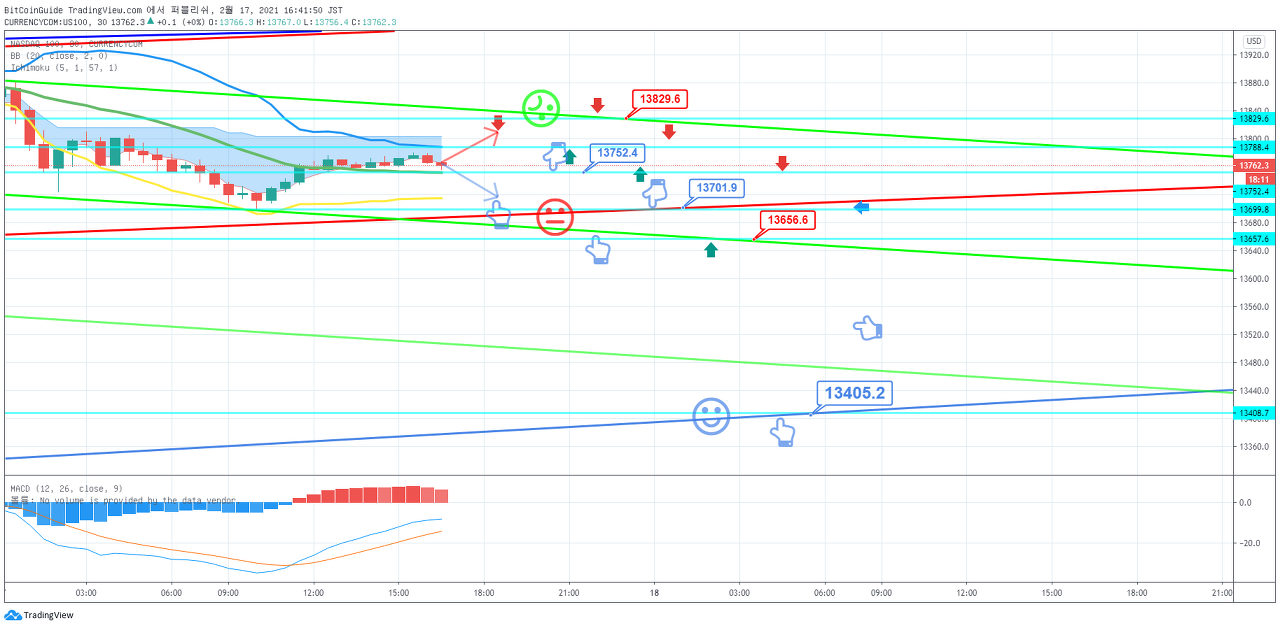 45202.5 지점에서 하락한다면, 단기 Stop Los가 필요합니다. 다만, 상승 추세선 (3)을 터치하고 상승할 수 있으므로 신중한 트레이딩이 필요합니다.
