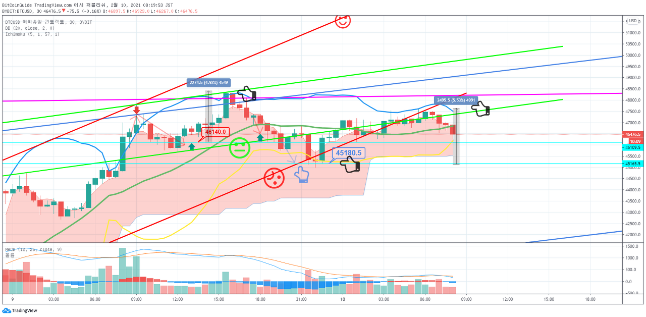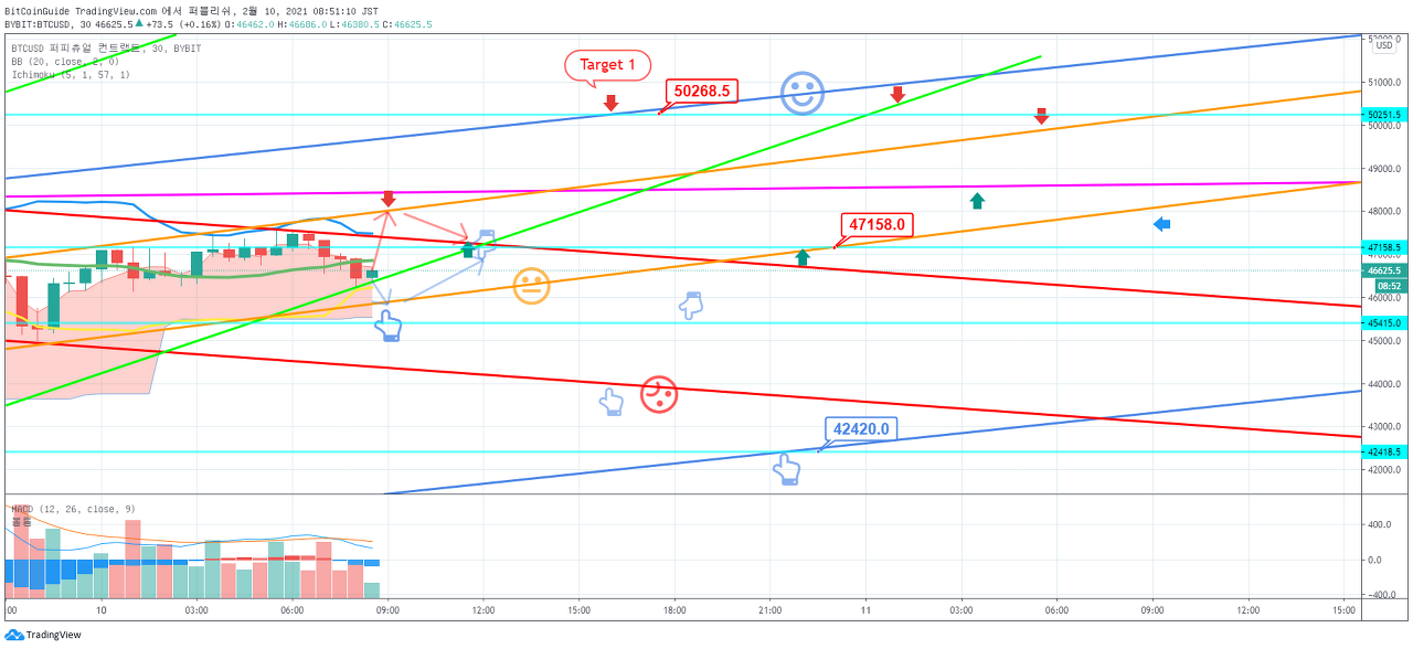 2. 진입 지점 : 47423.5 지점을 상향 돌파시 목표 지점 : 49584.5 지점 이상 Stop Loss : 46703.0 지점