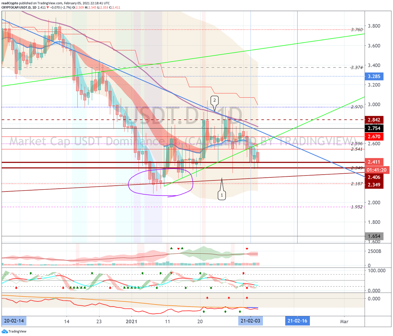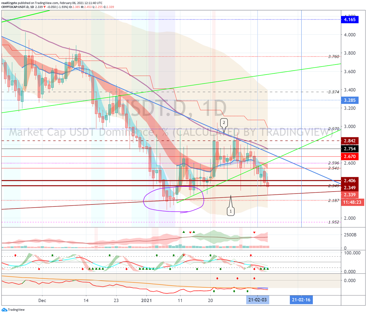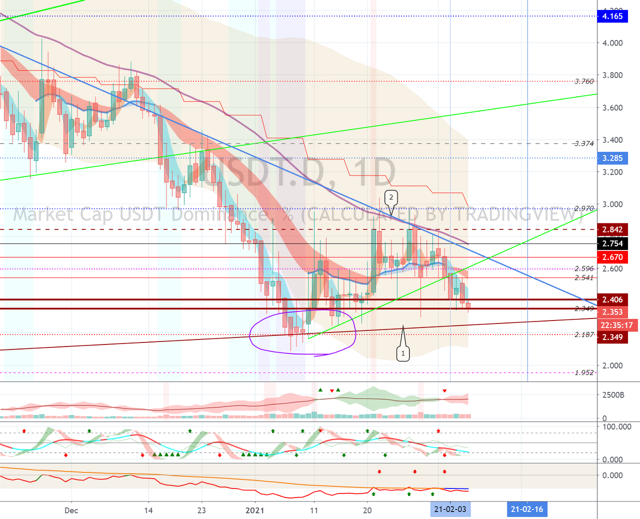 방향 결정에 있어서 중요한 것은 자금의 흐름이 어떻게 되는지를 지켜보는 것이라고 생각합니다. 이에 따라서, USDT 도미넌스가 2.187-2.541 구간에서 벗어나는 움직임이 나오는지 지켜봐야 합니다. USDT 도미넌스가 하락하게 된다면, 자금이 코인 시장에서 코인을 매수하고 있다고 생각합니다.