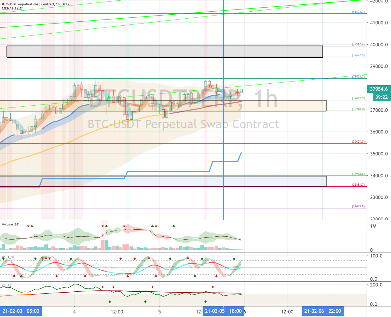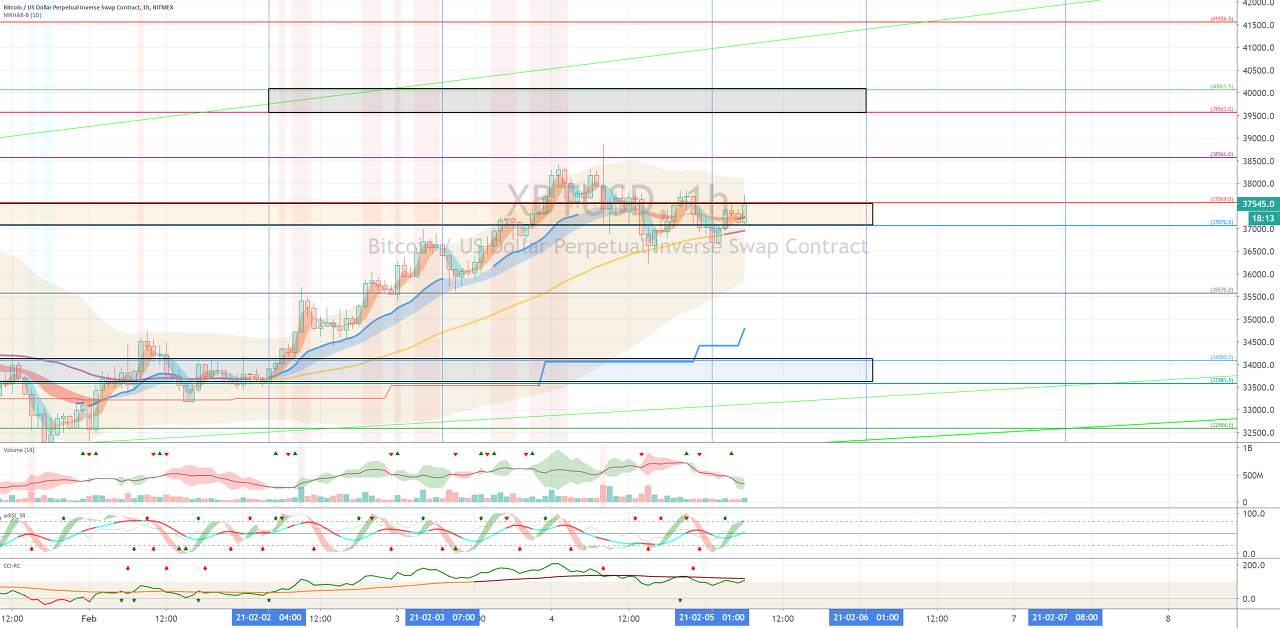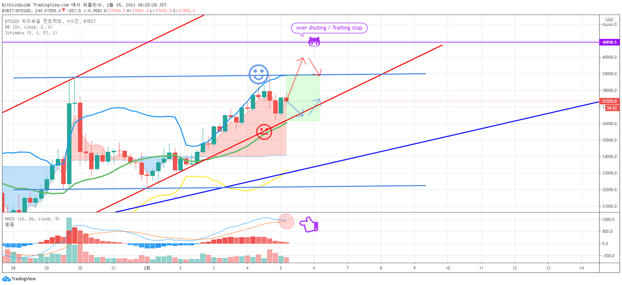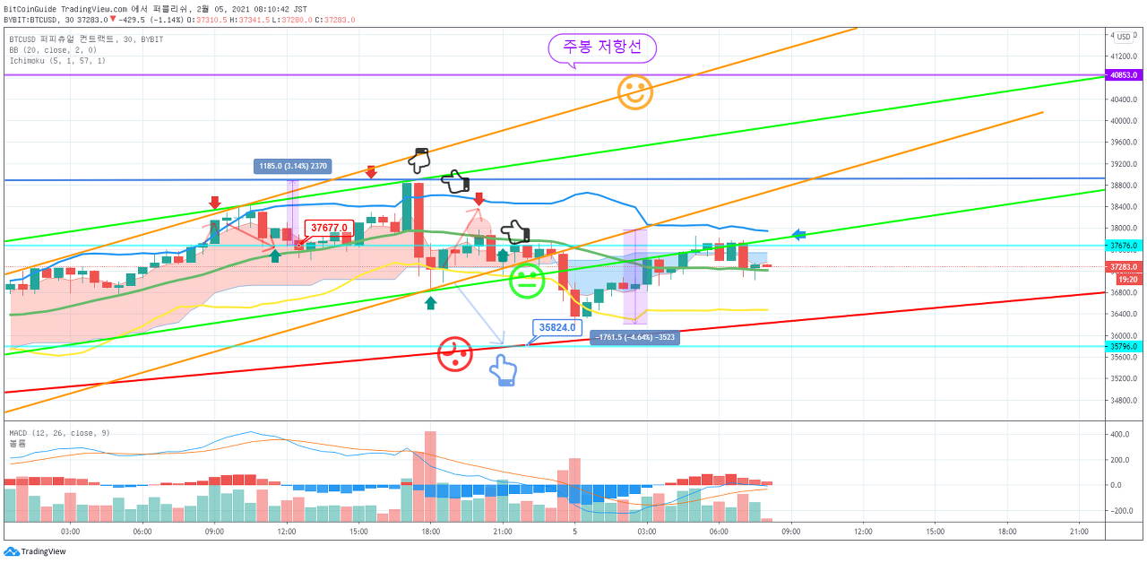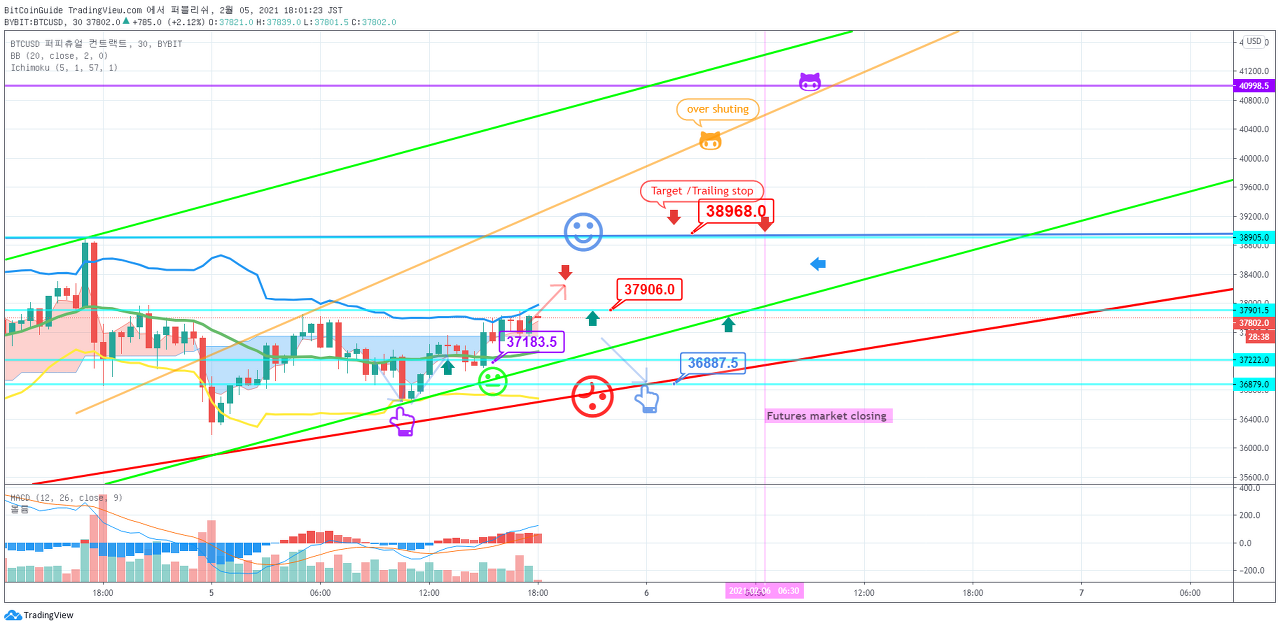 2월 5일경 (2월 4일-6일)의 변동성으로 35660.0-39915.0 구간에서 벗어나는 움직임이 나오는지 지켜봐야 합니다. 특히, 37790.0 지점 이상 상승하여 지지를 받을 수 있는지 지켜봐야 합니다. 현재 변동성 기간에 속해 있으므로, 신중한 트레이딩이 필요합니다.