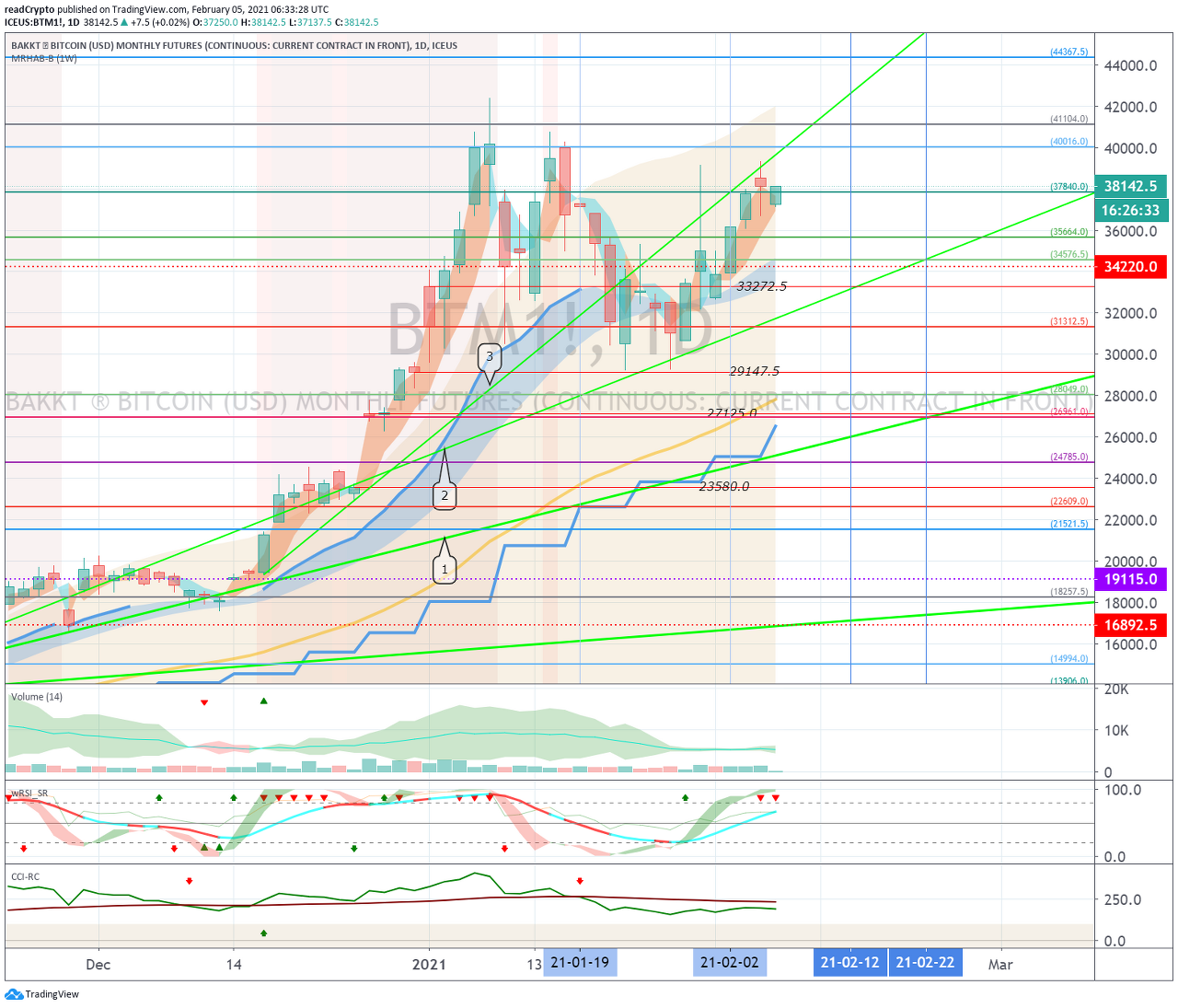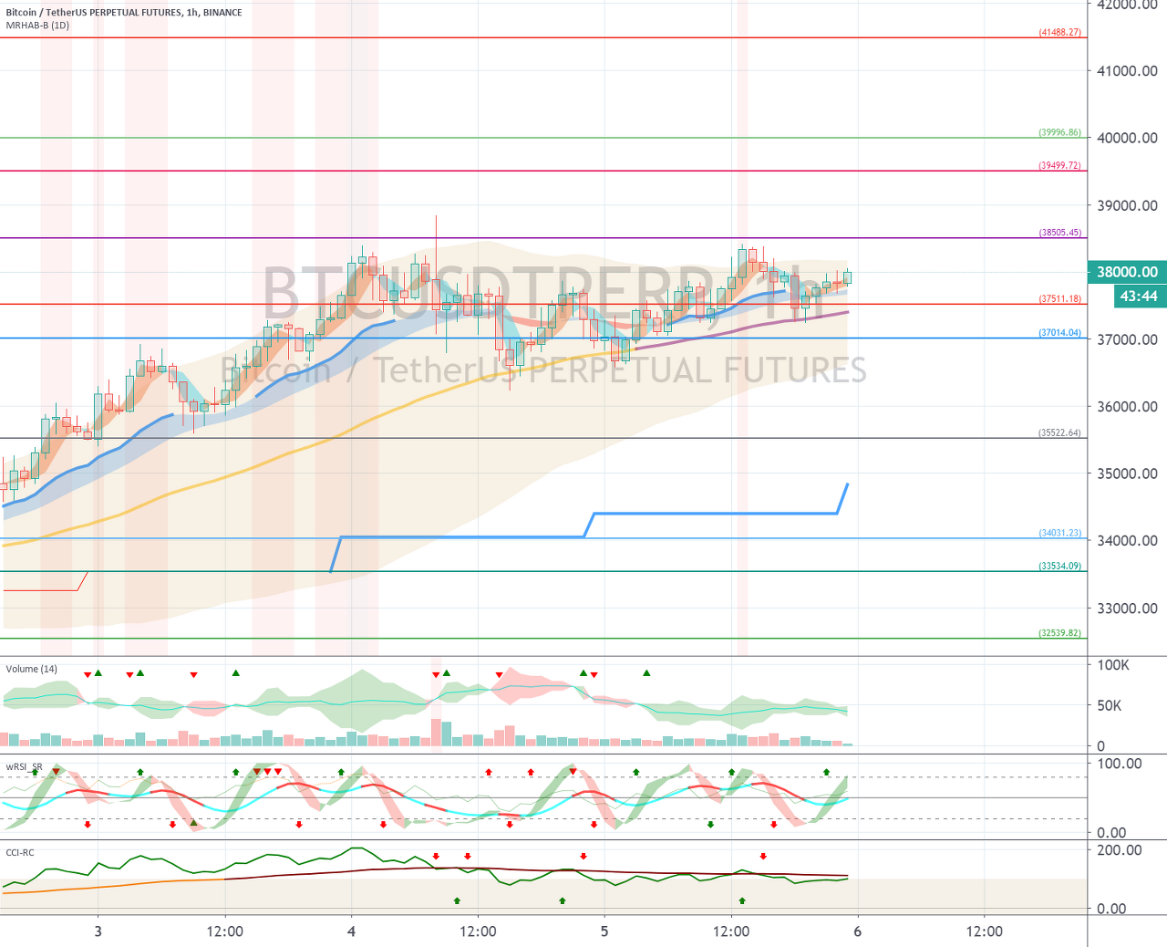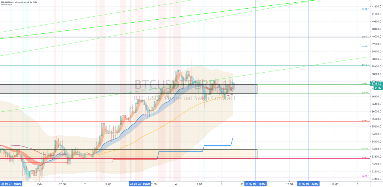 2월 5일경 (2월 4일-6일)의 변동성으로 35660.0-39915.0 구간에서 벗어나는 움직임이 나오는지 지켜봐야 합니다. 특히, 37790.0 지점 이상 상승하여 지지를 받을 수 있는지 지켜봐야 합니다. 현재 변동성 기간에 속해 있으므로, 신중한 트레이딩이 필요합니다.