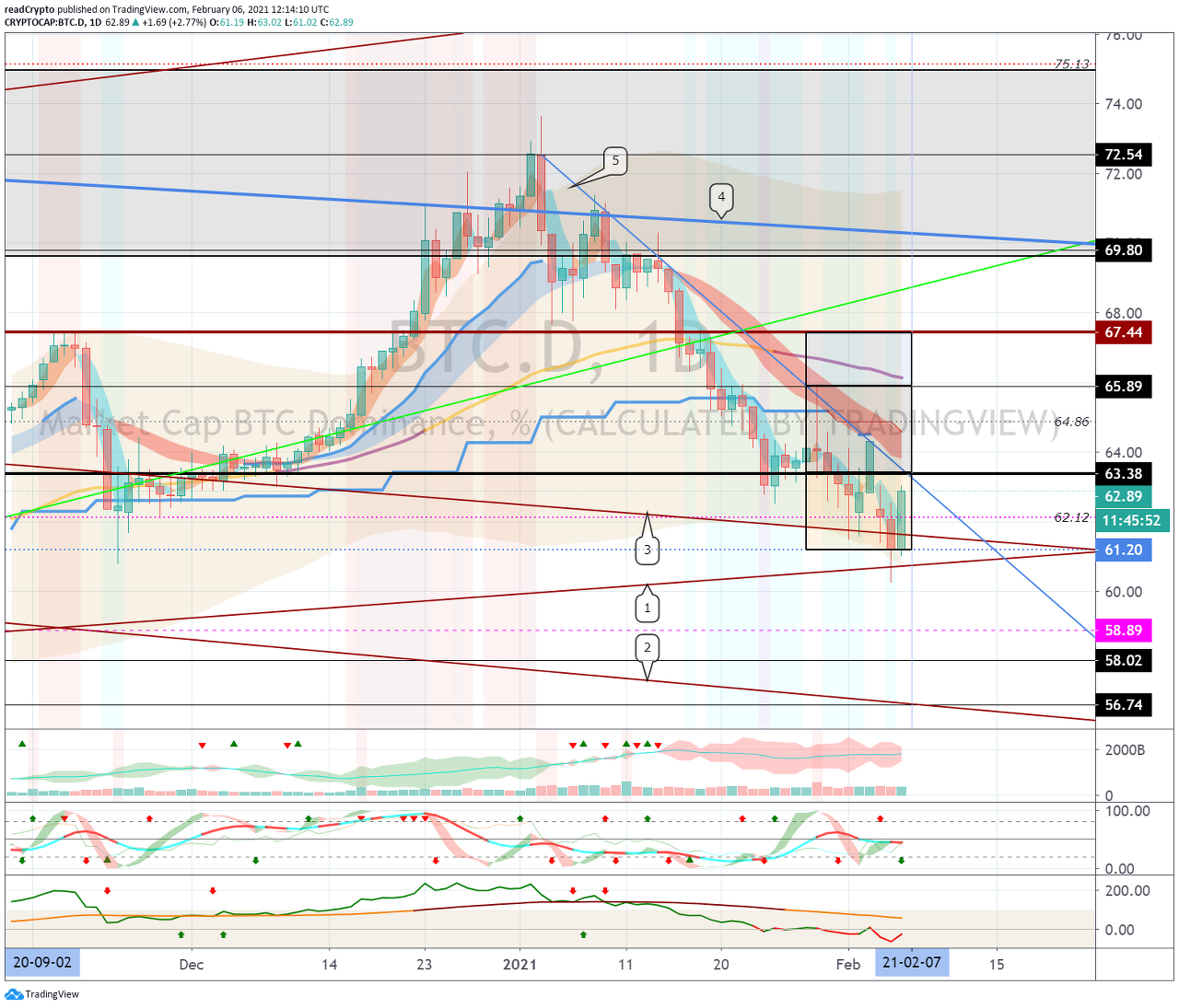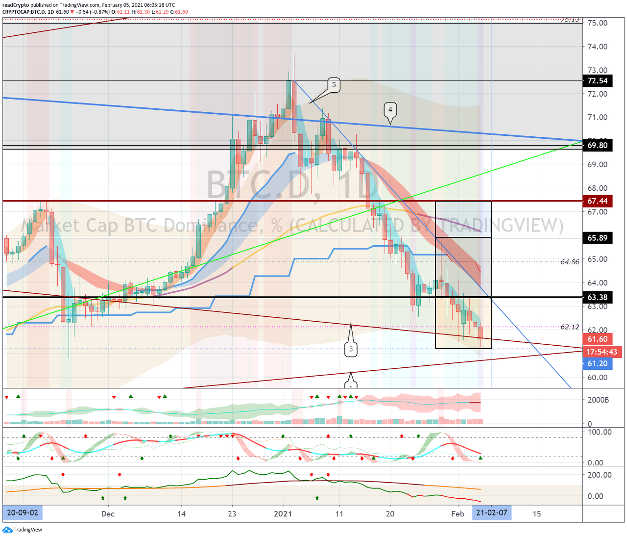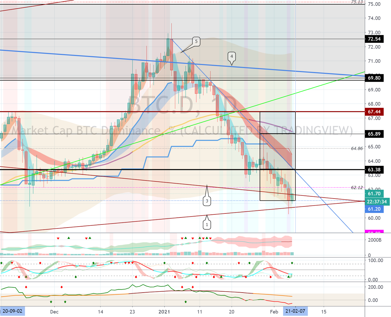 2월 7일경 (2월 6일경-8일)의 변동성으로 61.20-63.38 구간에서 벗어나는 움직임이 나오는지 지켜봐야 합니다. BTC 도미넌스의 상승은 알트코인들의 가격 하락을 의미한다고 생각합니다. 현재 BTC 가격이 상승하면서 BTC 도미넌스가 상승하여 자금이 BTC쪽으로 집중되고 있다는 것을 보여주고 있다고 생각합니다. 이에 따라서, 알트코인들의 가격은 횡보하거나 하락할 수 있습니다.