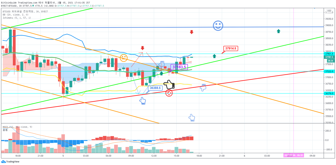 (LONG) 1. 진입 지점 : 37442.9 지점을 상향 돌파시 목표 지점 : 1차 38432.7 지점 이상, 2차 39422.5 지점 이상 Stop Loss : 36948.0 지점