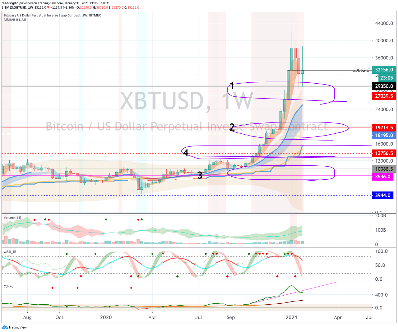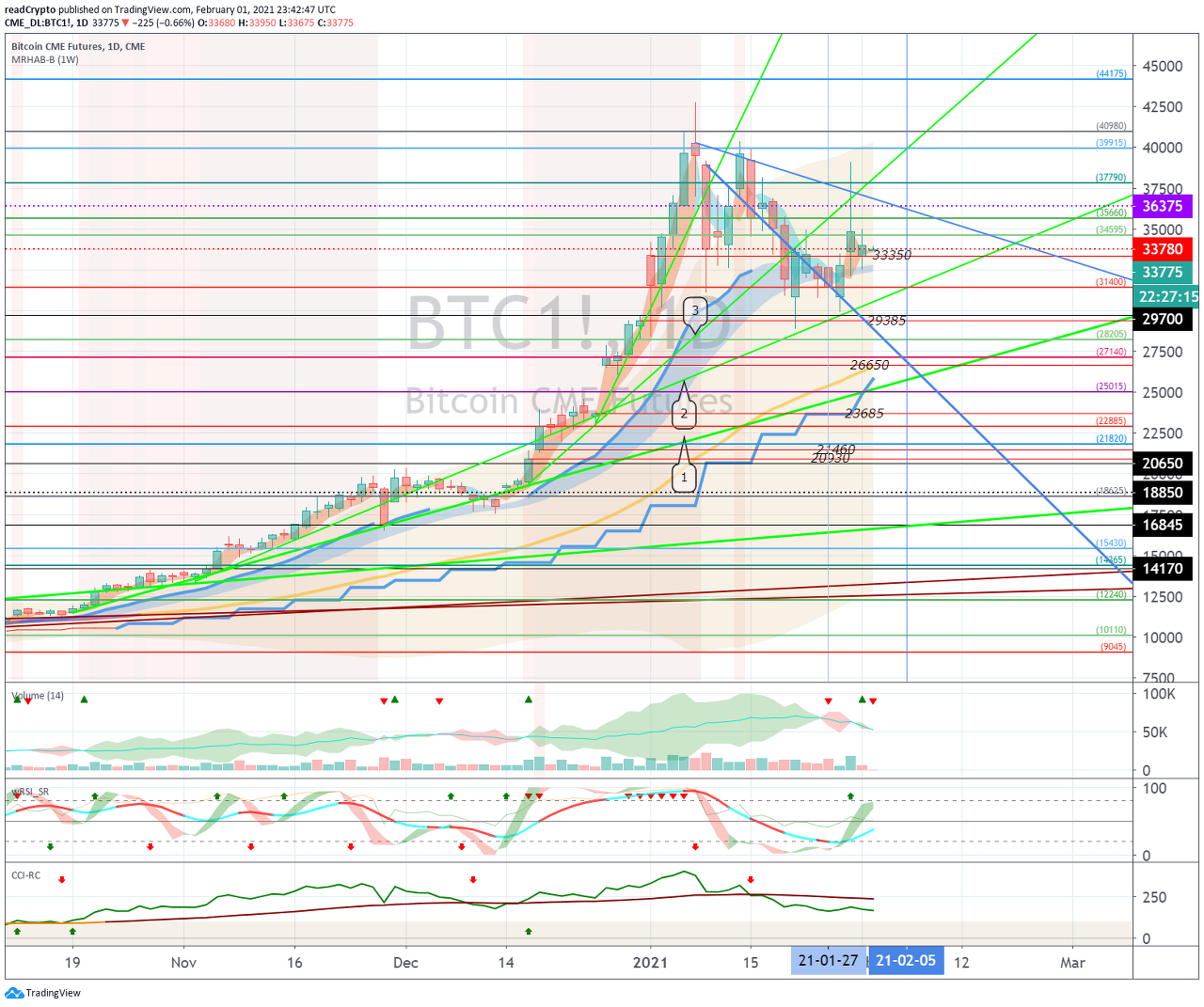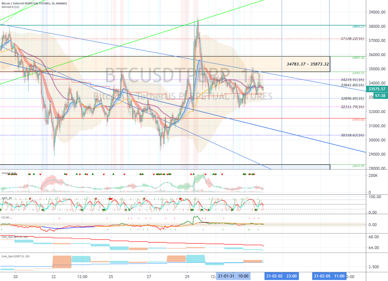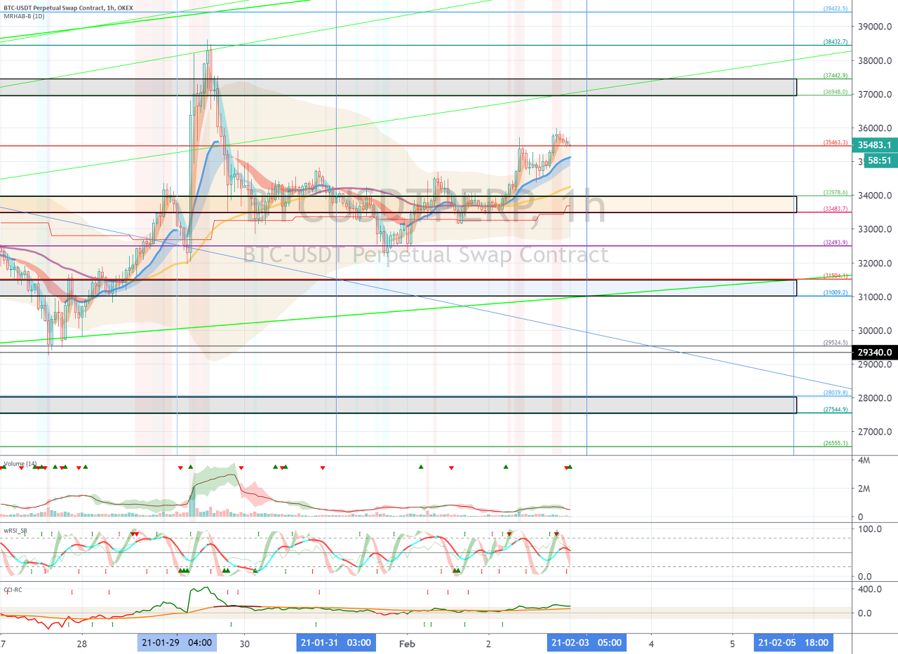 2월 5일경 (2월 4일-6일)의 변동성으로 35660.0-39915.0 구간에서 벗어나는 움직임이 나오는지 지켜봐야 합니다. 특히, 37790.0 지점 이상 상승하여 지지를 받을 수 있는지 지켜봐야 합니다. 현재 변동성 기간에 속해 있으므로, 신중한 트레이딩이 필요합니다.