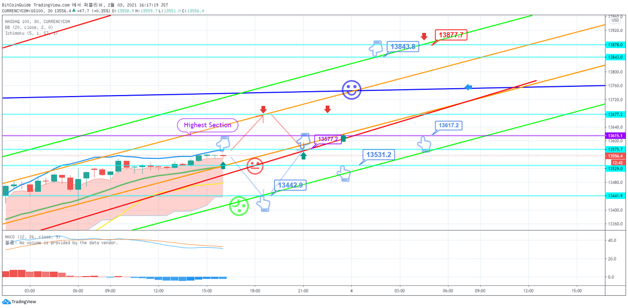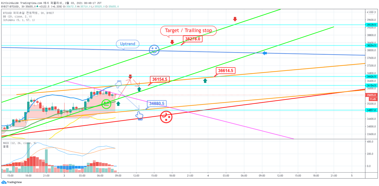 (LONG) 1. 진입 지점 : 34080.0 지점을 상향 돌파시 목표 지점 : 1차 35575.0 지점 이상, 2차 37070.5 지점 이상 Stop Loss : 33581.5 지점