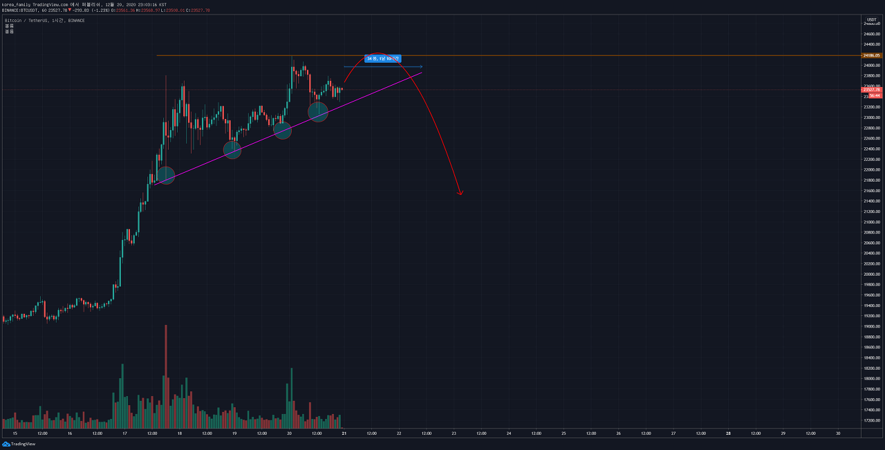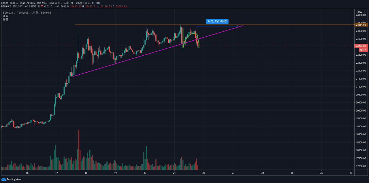 다만, 23,500$부근의 고점부근에서 거래량이 크게 터지기 시작하여, 슬슬 매도물량이 나오고 있는 것이 아닌가? 의심을 들게합니다