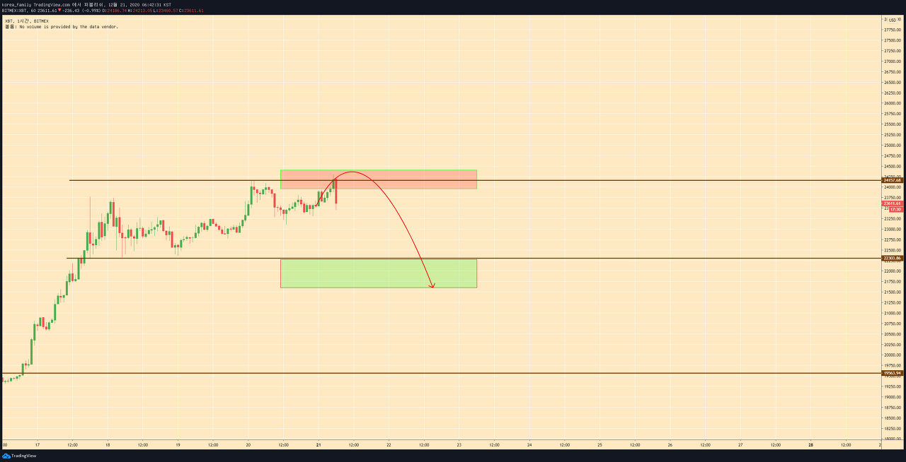 20,000$을 넘기고 단기간에 24,000$까지 빠르게 상승하였으며, 거래량도 상대적으로 많이 쏟아져 나왔습니다