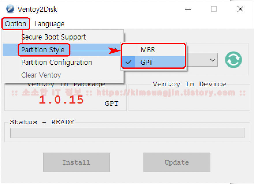 10. 2020/07/09 - New release Ventoy 1.0.15 MBR/GPT 지원 : 기존 MBR 파티션 테이블 만 지원하던 것에서 GPT 파티션 테이블 선택가능해짐에 따라서 2.2TB를 초과하는 디스크도 단일 파티션으로 ventoy 부팅 디스크를 제작하거나 파티션할 수 있게되었습니다. 하지만, Legacy 모드로 설치를 고려한다면 MBR을 선택하는 것이 현명한 방법입니다. 사실, 부팅 디스크를 2.2TB 초과하는 디스크를 사용할 일도 거의 없습니다. UEFI 모드만 사용한다면 GPT를 선택하는 것을 개발사에서도 권장하고 있습니다. ▼