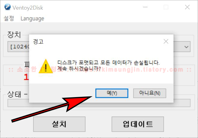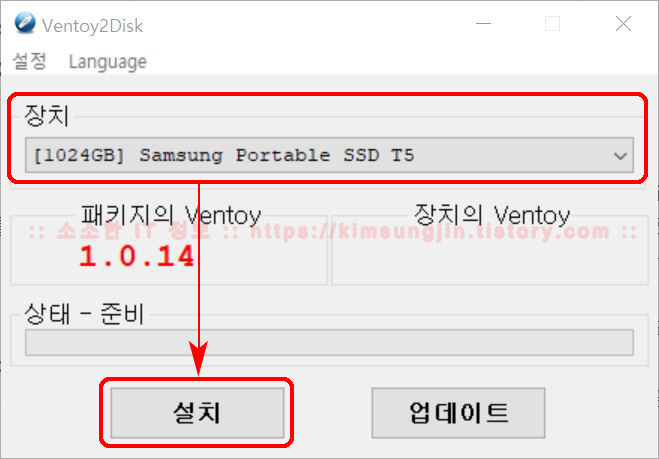 4. "장치" Ventoy USB를 제작할 디스크를 선택합니다. 그리고 "설치" 버튼을 클릭합니다. 여기서 중요한 것은처음으로 Ventoy USB를 제작할 때는 포맷이 되기 때문에 반드시백업 후 설치를 클릭하셔야 합니다. ▼