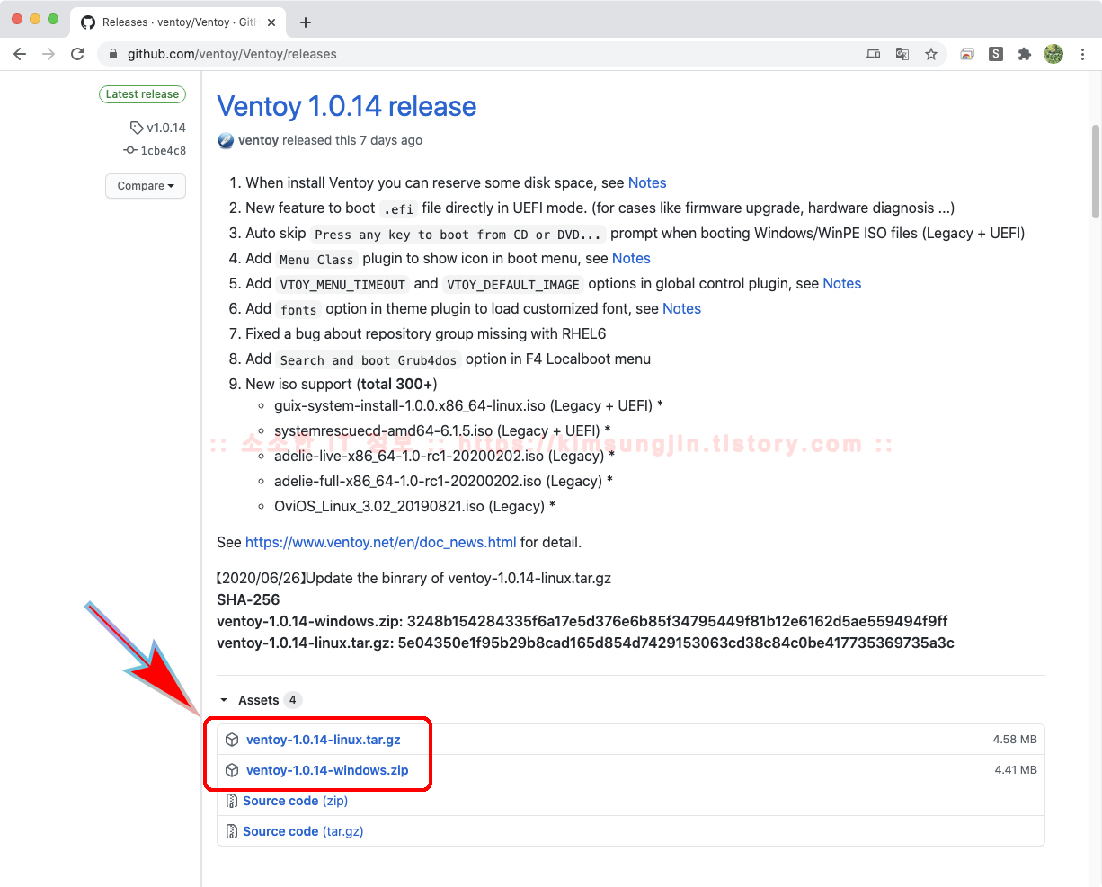 ✅ Ventory 다운로드먼저 Ventoy를 다운로드 받아 보겠습니다. 파일 용량도 상당히 가볍습니다. 현재 최신 1.0.14 버전을 기준, Windows 버전이 약 4.5MB이고, Linux 버전이 약 4.6MB입니다. 아래 링크를 클릭하면 다운로드 페이지로 연결됩니다. 공식 페이지에서 직접 배포하는 것은 아니고, github.com을 통해 배포하기 때문에 한번 더 링크를 타고 들어가야 합니다.