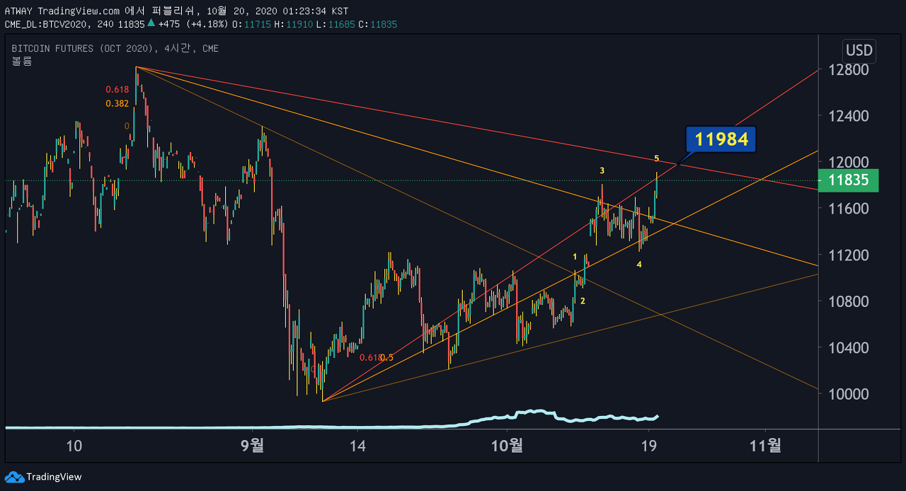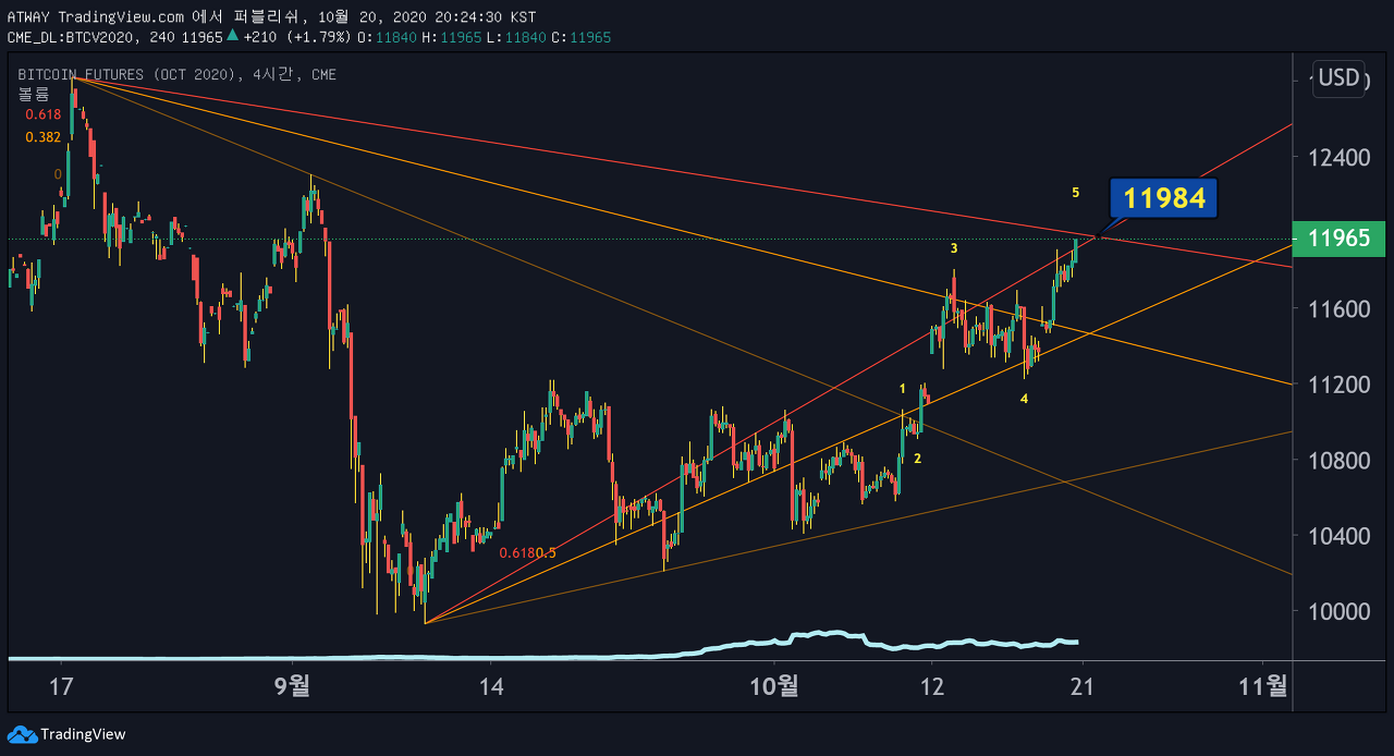 CME BTC 피보나치팬의 저항이 11980달러 정도에 있습니다. 지금 역시 피보나치팬의 저항을 받고있습니다.