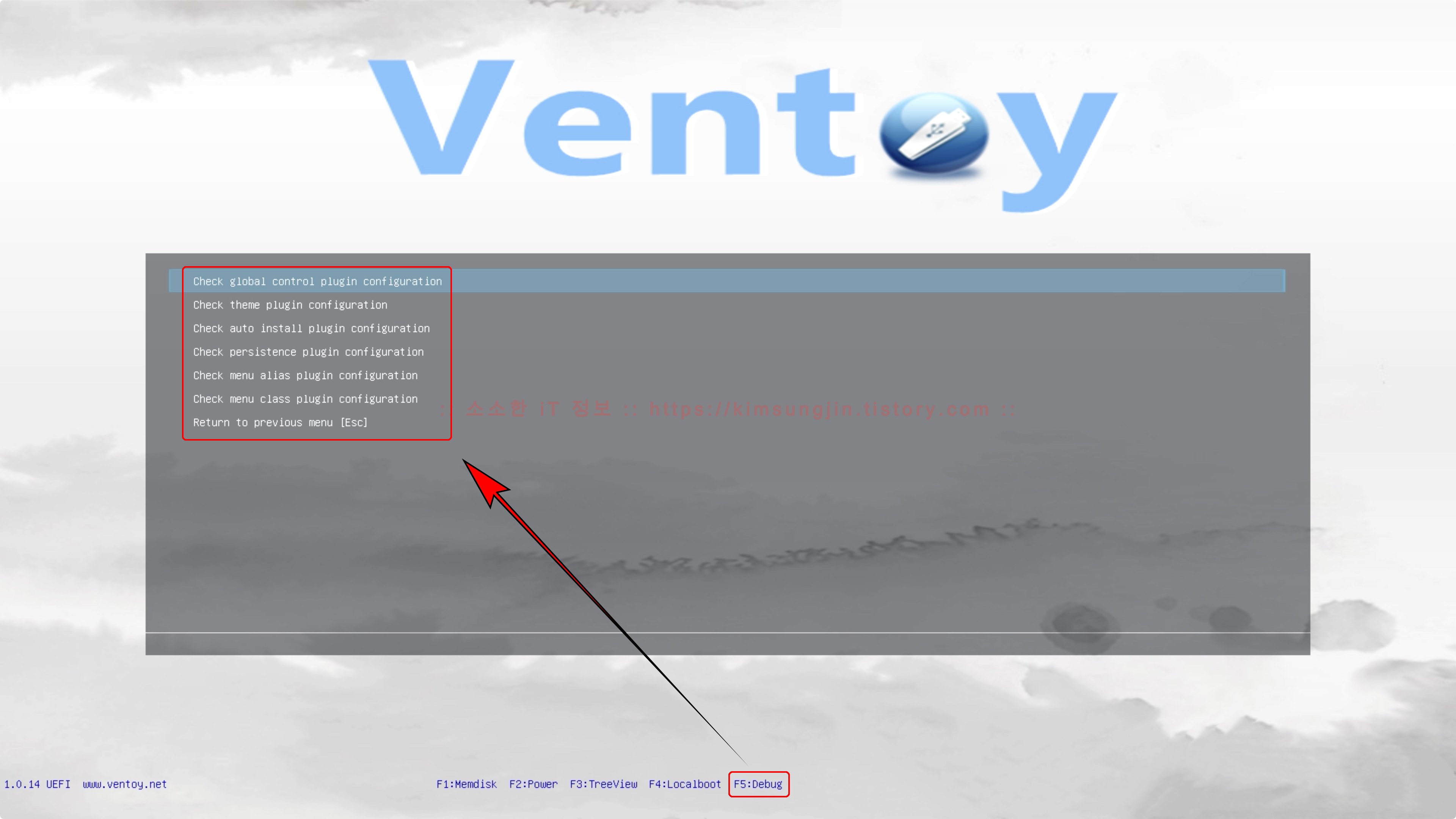 ❼F5:Debug- Ventoy의 추가 기능인(플러그인)ventoy.json의 내용을 Debug 할 때 사용하게 됩니다. 글로벌 설정, 테마, 메뉴 클래스, 메뉴 별명 등등...ventoy.json에 입력된 추가 기능을 확인할 때 사용하게 됩니다. 이런 기능을 반드시 사용하지 않는 경우라면 사용하지 않습니다. 추가 기능에 대해서는 별도로 포스팅해 보도록 하겠습니다.기능키는 F5입니다.▼