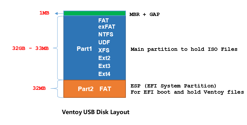 8.파티션 구조가 간단하다. 강력한 기능을 지원하지만, 파티션의 구조는 매우 간단합니다. 아래와 같이MBR(Legacy 부팅을 위한 Master Boot Record),데이터 파티션 Part1(ISO 파일을 넣어 둘 공간, 개인 파일),EFI 시스템 파티션 Part2(FAT)으로 매우 심플하고 실제 사용자의 시스템에는 데이터 영역만 보이기 때문에 시스템을 손상시킬 경우도 발생하지 않습니다. 자세한 설명은 아래를 참조 바랍니다.