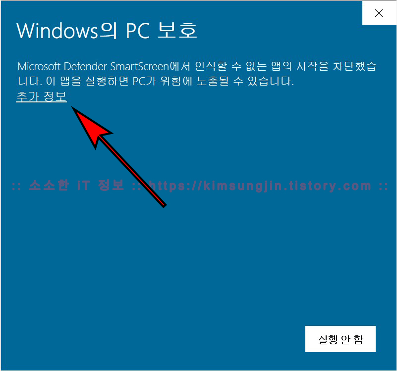 2. 압축 해제한 Ventoy 폴더에서 Ventoy2Disk.exe를 실행합니다. 실행 중"Windows의 PC 보호"창이 뜨는데요, 여기서"추가 정보"를 클릭합니다. ▼