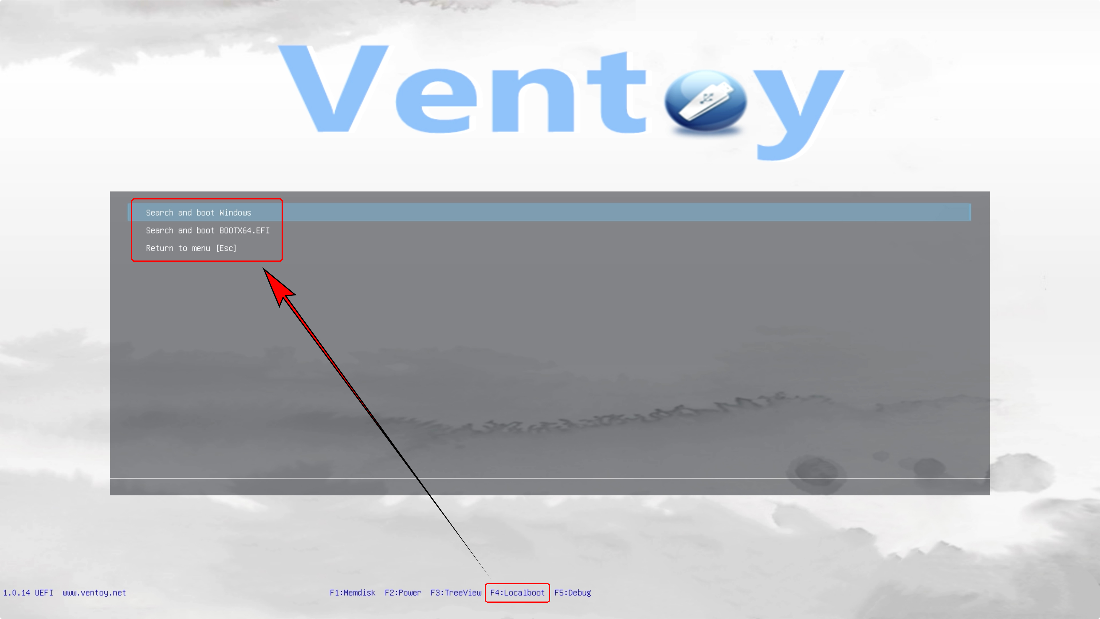 ❻F4:Localboot- Ventoy로 부팅을 하였지만, 그냥 PC의 Windows로 정상 부팅을 하고 싶은 경우 Localboot를 선택하시면 됩니다. 기능키는 F4입니다.▼