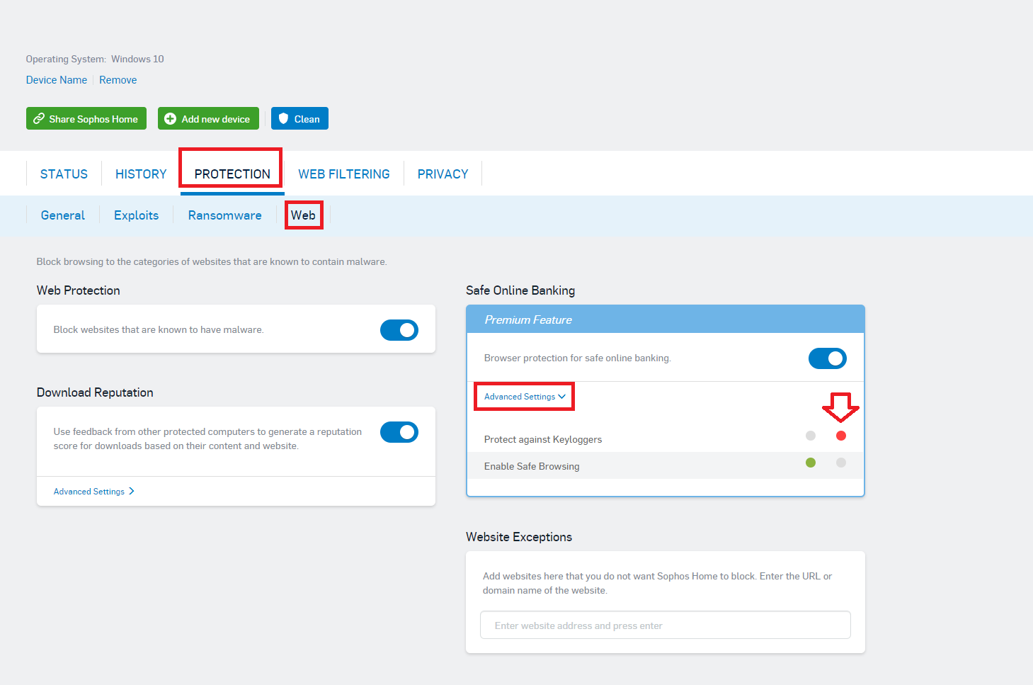 2) Click on Protection tab > Select " Web " subsection >Safe Online banking